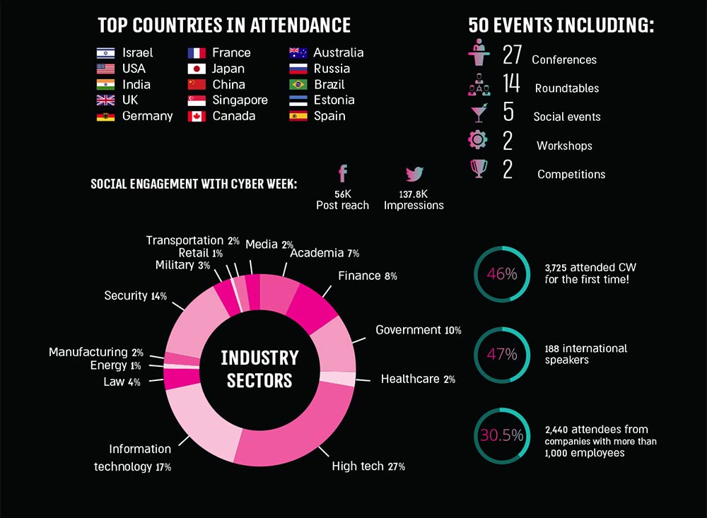 Each year, Cyber Week, attracts an increasing amount of top-tier leaders both in the commercial and governmental sectors. In 2018, over 8000 people from 80 countries attended the event, including; CEOs, CISO, C-level Executives, government representatives, diplomats, military personnel, academics, investors and startups.