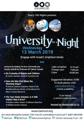 The University for a Night was held at the prestigious Rothschild & Co where three leading faculty from Tel Aviv University (TAU) shared with 150 guests their pioneering cross disciplinary research in their respective specialist fields ranging from politics of the Middle East and PTSD research to curiosity and robots.