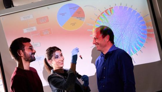 Featured image: Prof. Noam Shomron (right) discusses test results with MDPhD candidate Yazeed Zoabi (left) and doctoral candidate Meitar Grad in his medical genomics lab. (Photo: Yoram Reshef)